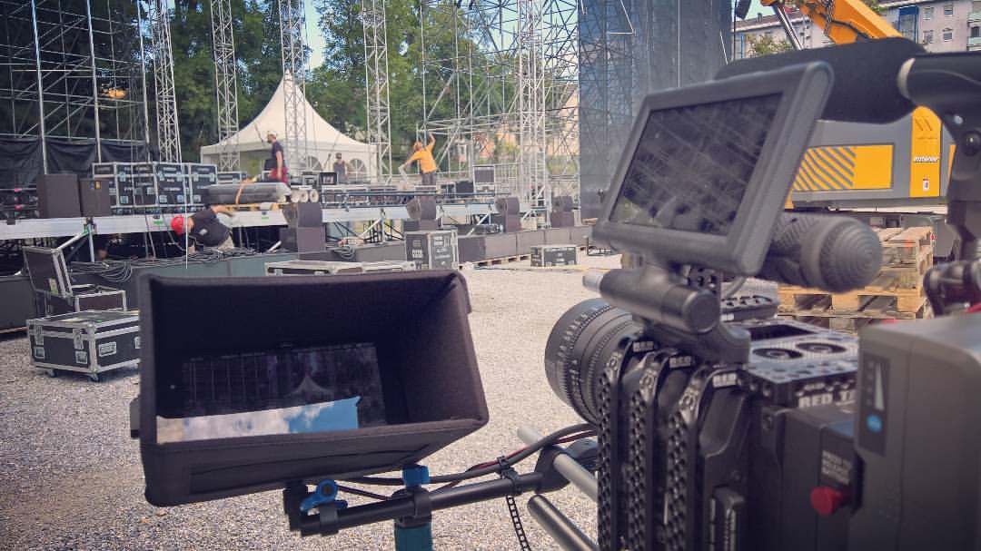 Beim Aufbau für das Andrea Bocelli Konzert